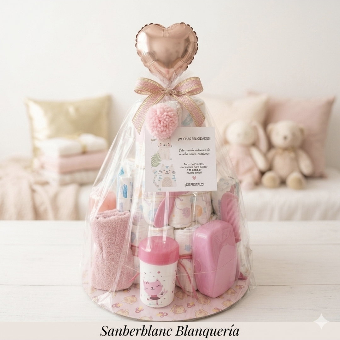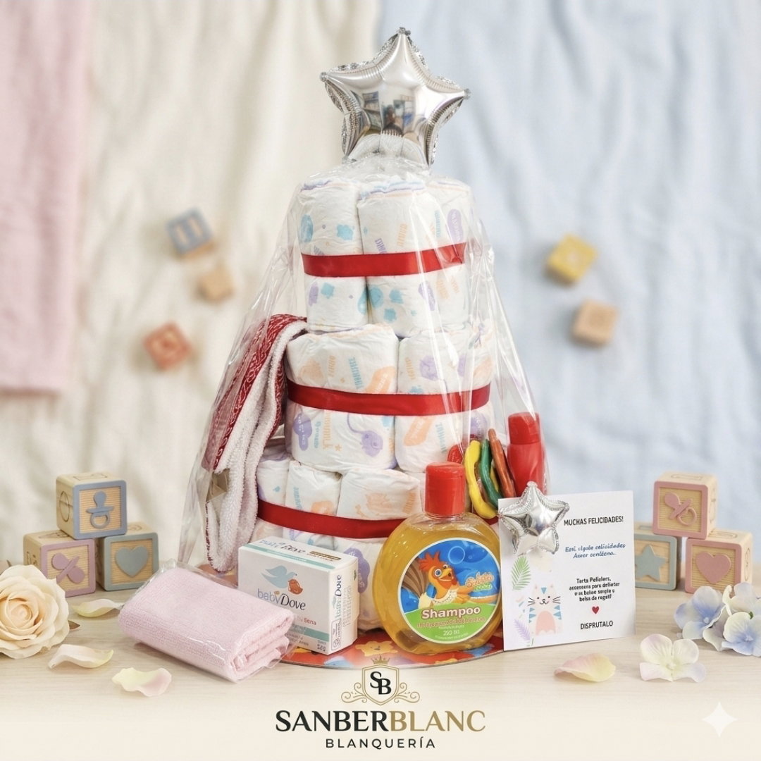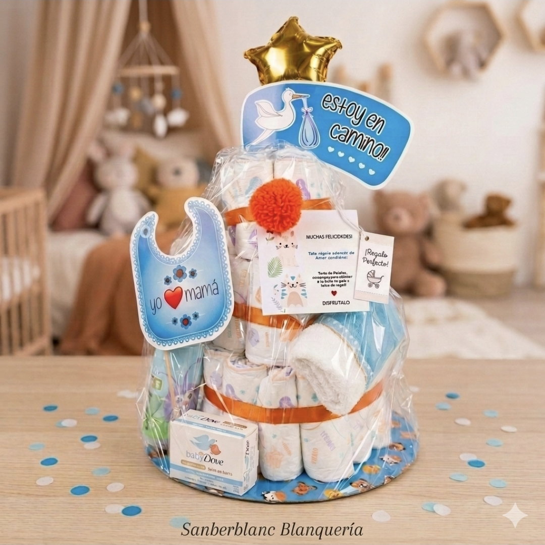 Da la bienvenida al nuevo miembro de la familia con nuestra encantadora Torta de Pañales. Este regalo, meticulosamente ensamblado, no solo es un detalle visualmente atractivo, sino también increíblemente práctico, repleto de artículos esenciales que los nuevos padres apreciarán. Es la combinación perfecta de ternura y utilidad para celebrar un nacimiento, fiesta de Revelacion de sexo o un baby shower.